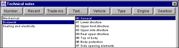 The Vehicle, After-Sales type, Engine, Gearbox buttons: