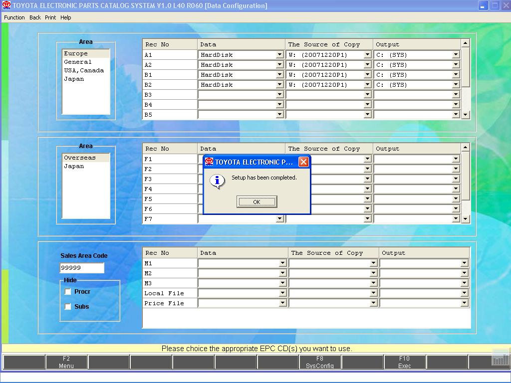 11. ÂÛÁÅÐÈÒÅ ÍÓÆÍÛÉ ÂÀÌ ÐÅÃÈÎÍ (ÍÀÏÐÈÌÅÐ ÅÂÐÎÏÀ) È ÍÀÏÐÎÒÈ ÊÀÆÄÎÃÎ ÄÈÑÊÀ (À1, À2, Â1 è.ò.ä.) ÓÊÀÆÈÒÅ ÒÈÏ ÓÑÒÀÍÎÂÊÈ ( ÊÎÏÈÐÎÂÀÒÜ ÍÀ HDD ÈËÈ ÐÀÁÎÒÀÒÜ Ñ CD), ÈÑÒÎ×ÍÈÊ ÄÀÍÍÛÕ È ÁÓÊÂÓ HDD, ÍÀ ÊÎÒÎÐÛÉ ÍÅÎÁÕÎÄÈÌÎ ÑÊÎÏÈÐÎÂÀÒÜ ÄÀÍÍÛÅ.  ÏÎËÅ Sales Area Code ÂÑÒÀÂÜÒÅ ÊÎÄ - 99999. ÍÀÆÌÈÒÅ ÊËÀÂÈØÓ F10. ÄÀÍÍÓÞ ÎÏÅÐÀÖÈÞ ÍÅÎÁÕÎÄÈÌÎ ÏÐÎÂÅÑÒÈ ÄËß ÊÀÆÄÎÃÎ ÐÅÃÈÎÍÀ  ÎÒÄÅËÜÍÎÑÒÈ.