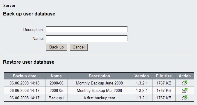 This functionality is available via the menu Server -> Backup and restore user database. You can (optionally) provide a short name and a description for this backup which makes it easier for you to find out, what the content of the backup really is.