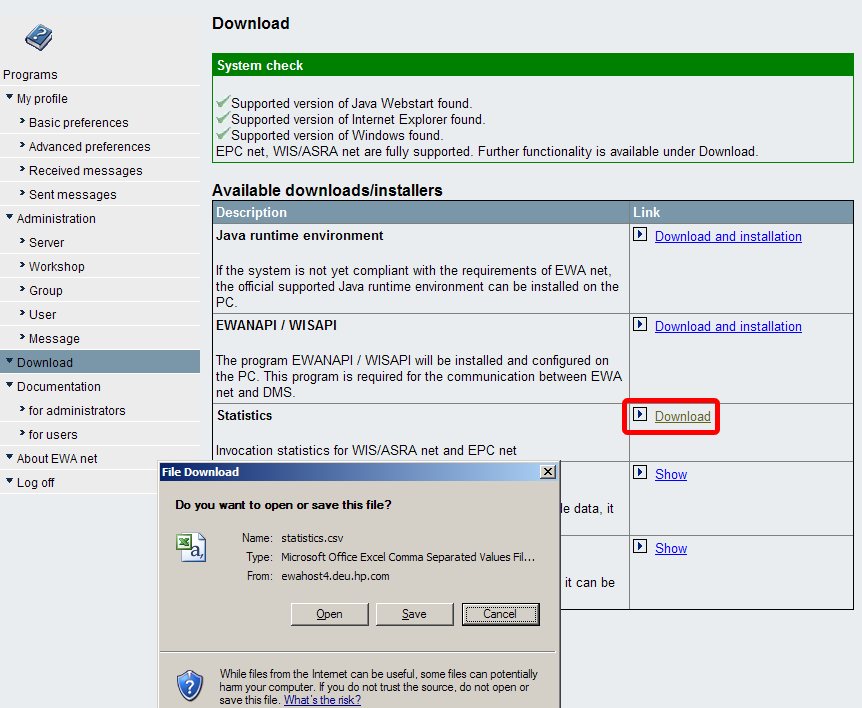 Administrators have access to a file download of the current statistic data via the Downloads section. Just click on the link to start the download. A file format "comma separated values" (CSV) will be sent to the browser which will in turn offer you to download or open it. If you have Microsoft Excel installed you will be prompted to open it directly in Excel.