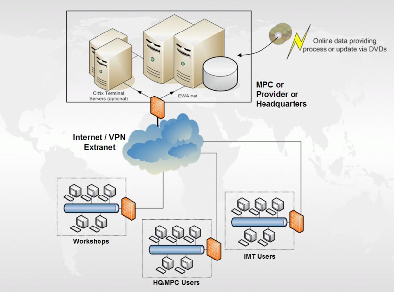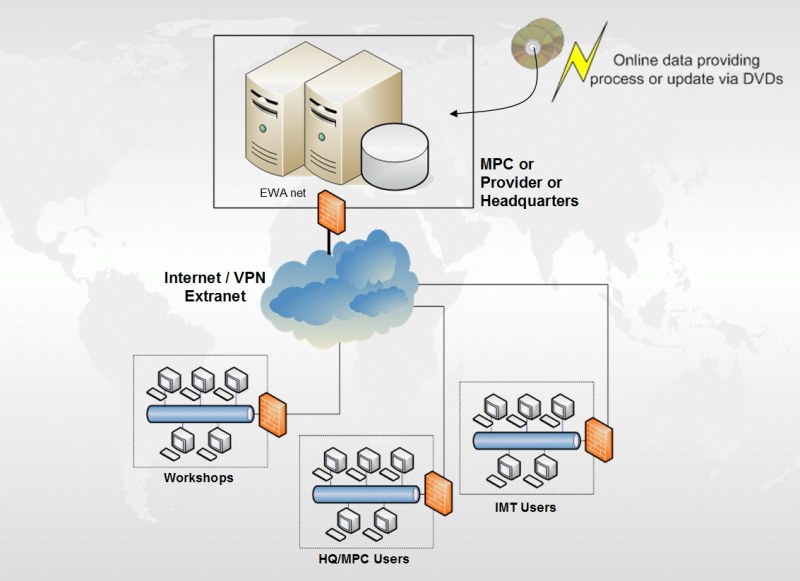 | Network / Internet | Users use an existing network connection or an Internet connection to access EWA from the MPC or other central instances (ASP). | The EWA server is located in a LAN in the dealer's environment - therefore no network connection from the workshop to the MPC or other central instances and no Internet connection is necessary. |